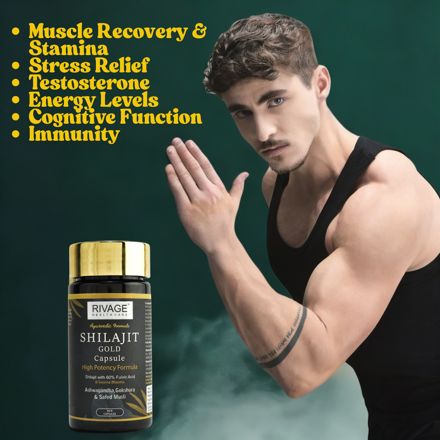 Rivage Shilajit Gold Resin is carefully created with a blend of pure himalayan shilajit, Ayurvedic bhasma made from 24 karat gold. This powerful combination helps to improve gym performance.